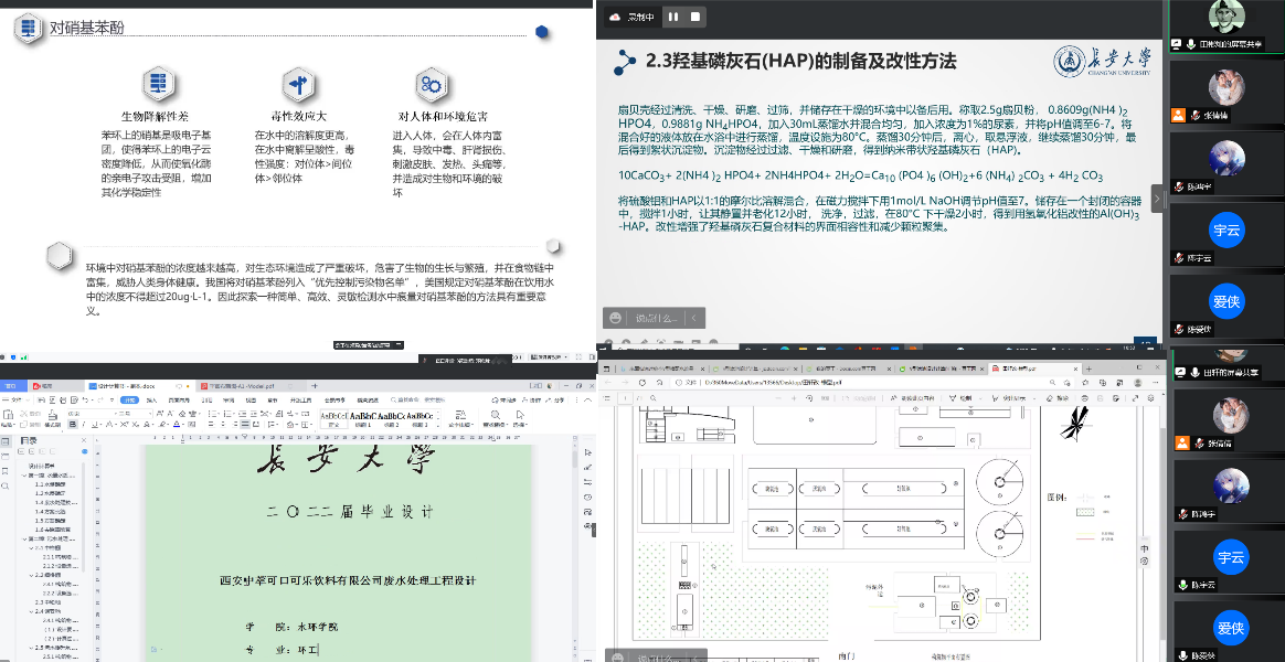 此次答辩环工、环科专业各2组,以腾讯会议的形式同时进行。每位同学答辩时间15分钟左右,先汇报了毕业设计(论文)的完成进度,再通过PPT、word或CAD图纸等方式介绍了毕业设计(论文)的完成情况,向老师请教了存疑的问题,也回答了老师提出的问题,最后列出了下阶段的进度安排。