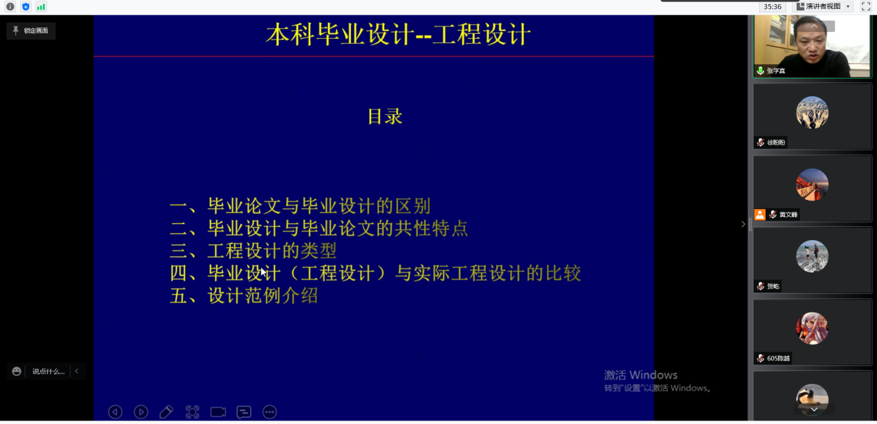 首先,黄文峰对教育部《本科毕业论文(设计)抽检办法(试行)》文件进行了解读,强调了贯彻落实“加强和改进教育督导评估监测,保证本科人才培养基本质量”精神的重要性,介绍了本科生毕业知网管理系统使用方法及学生和老师在毕业设计(论文)中承担的相应工作。随后,贺屹详细地介绍了学校(学院)对毕业设计(论文)工作进度的安排、重要的时间节点及应完成的工作。紧接着,邀请张学真系统地说明了毕业设计与毕业论文的区别、本科毕业设计-工程设计的类型、毕业设计与实际工程设计的区别、毕业设计的主要内容及如何撰写,并展示了往届本科毕业生优秀毕业设计(论文)范例。