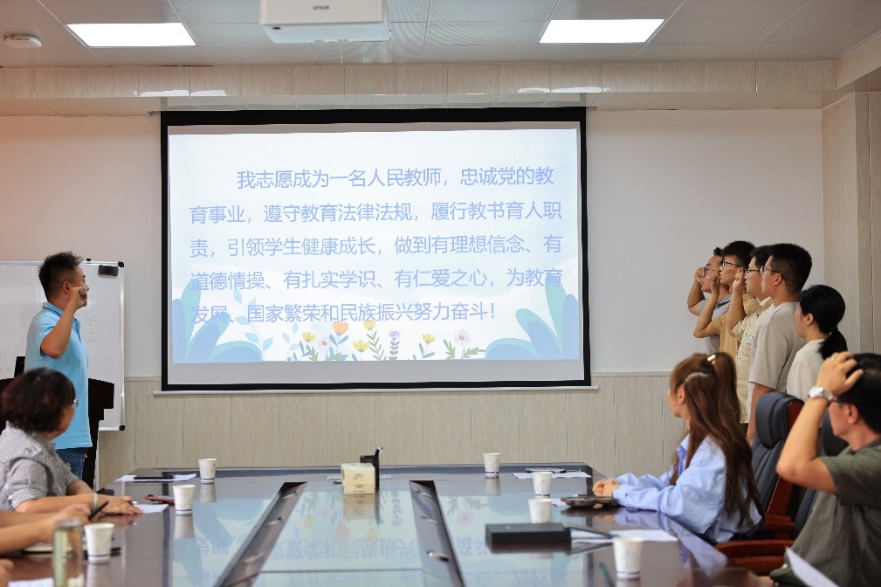 随后,全体新教工在工会副主席巩兴晖的带领下,郑重宣誓入职。学院教工代表杨胜科、年轻教工代表陈洁和新入职教工代表王翠分别发言。