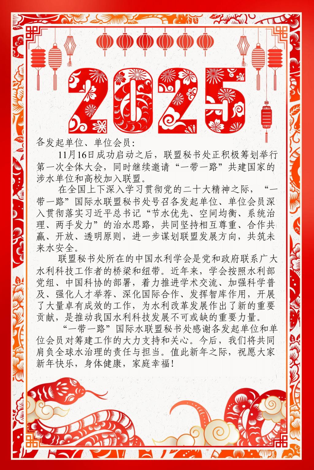 2025年1月2日,新年伊始,“一带一路”国际水联盟秘书处向各成员单位致贺词,向广大水利科技工作者致以节日的问候和诚挚的祝福,并展望未来合作的新篇章!