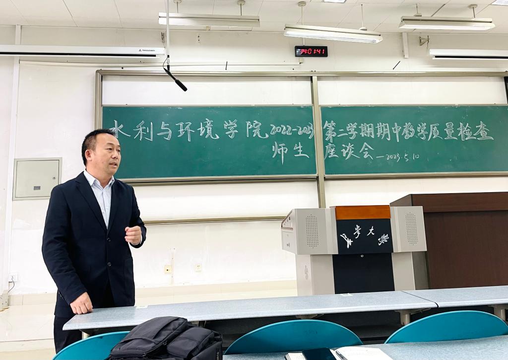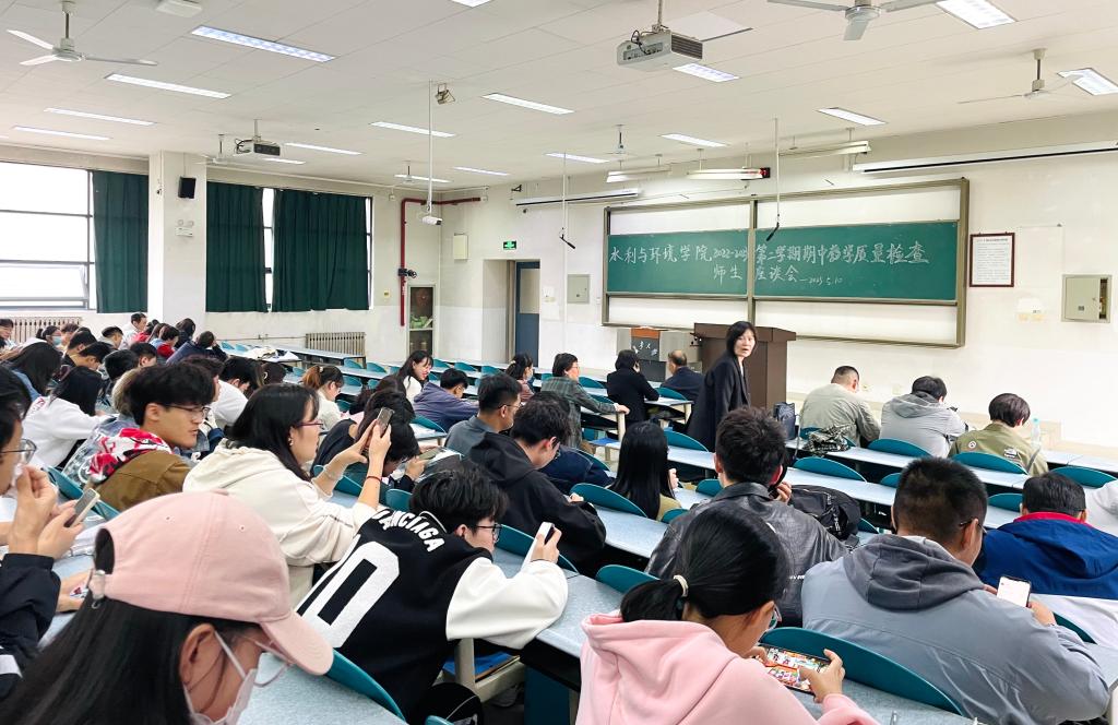 2023年5月10日12:40,学院本科期中教学质量检查师生座谈会在渭水校区WM1201教室举行。学院领导、本科教学督导、各系主任、实验中心主任、教师代表、辅导员、学院教务人员、各班级学生代表参加了座谈会。