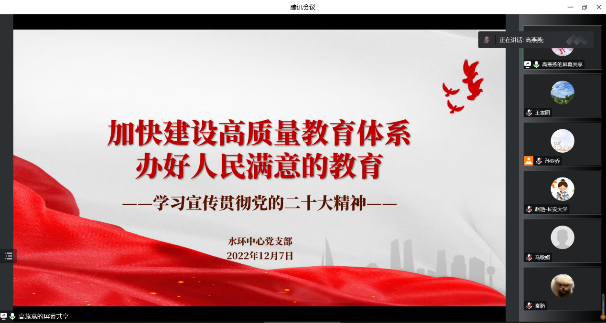 12月7日,水环实验中心党支部举办学习贯彻党的二十大精神主题党课学习活动,支部党员马雄德和高燕燕分别做了题为《学习贯彻党的二十大精神,推进产学研高质量发展》和《加快建设高质量教育体系,办好人民满意的教育》的主题报告。会议由支部书记孙亚乔主持,支部全体党员及水环中心全体教师参加了本次会议。