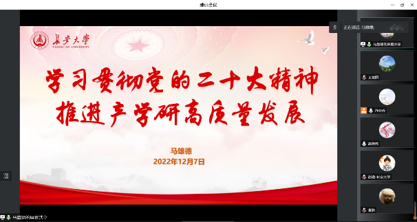 马雄德从“认识—学习领会习近平总书记重要讲话和党的二十大精神”“把握—深刻理解教育、科技、人才一体部署的时代内涵”“落实—以党的二十大精神为指引推动产学研高质量发展”三个方面展开报告。他从党的二十大的主题和成果,过去五年的工作和新时代十年的伟大变革,习近平新时代中国特色社会主义思想的世界观和方法论,中国式现代化,未来五年党和国家各项事业发展的战略部署等方面对党的二十大精神做了深入阐述;从服务“两个大局”、支撑“两个中心”建设以及“基础性、战略性支撑”的角度讲述了理解教育、科技、人才一体部署的重要作用、重大使命和时代定位。